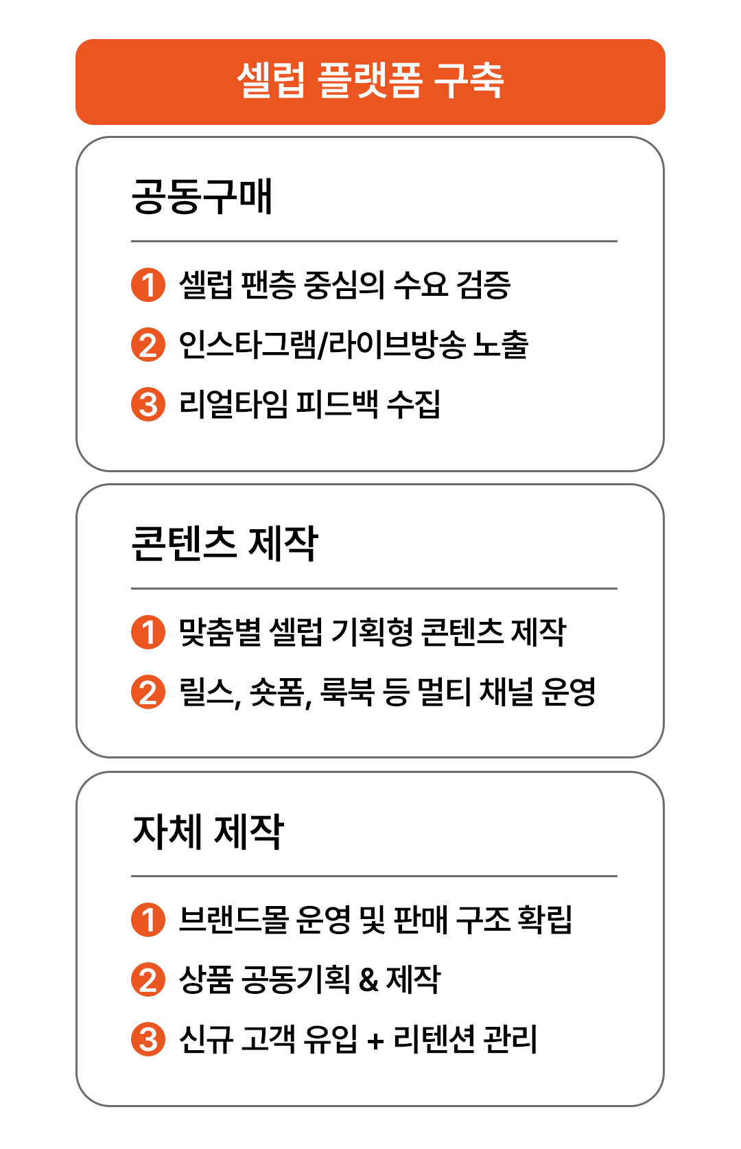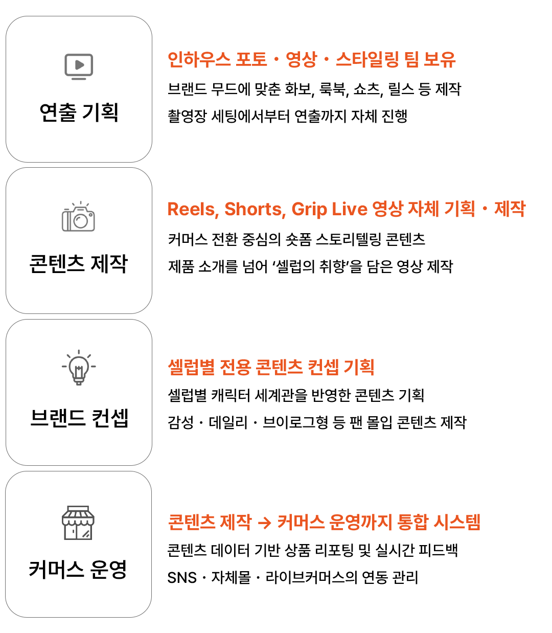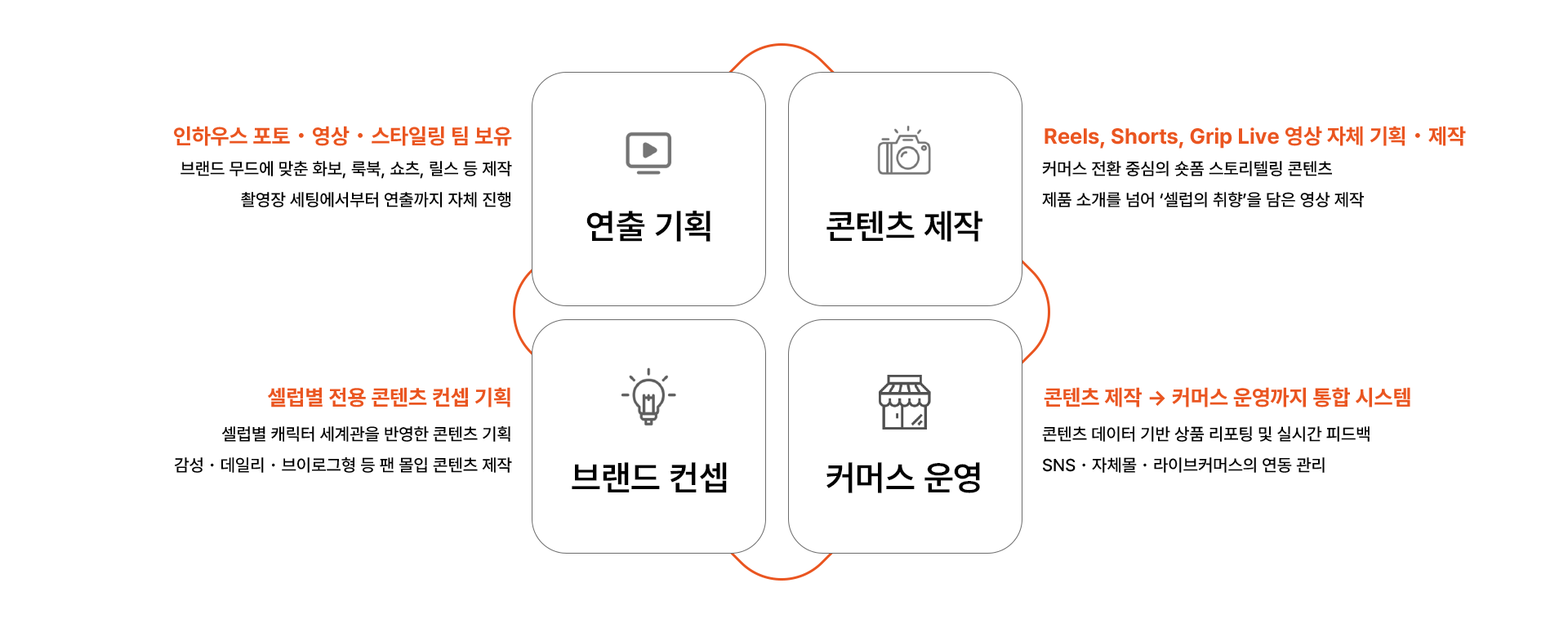 패션, 뷰티, 라이프스타일, 식품 등 다양한 분야에서 아티스트 아이덴티티가 반영된 콘텐츠를 기획하고 운영하며, 글로벌 시장에서 지속 가능한 수익 모델을 함께 만들어갑니다.